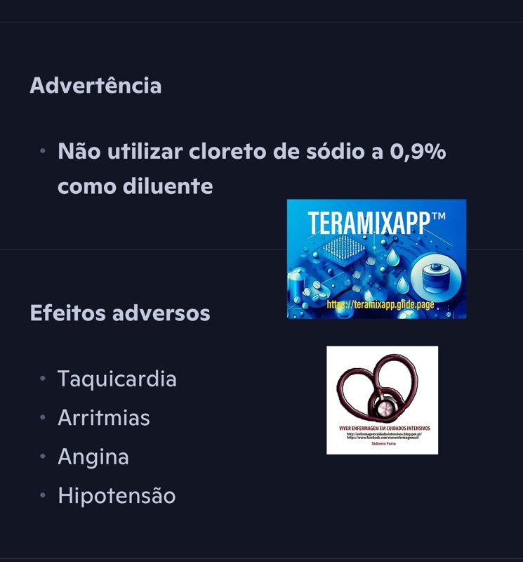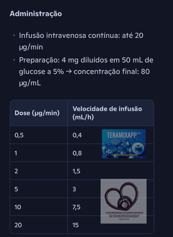• Preparação: 4 mg diluídos em 50 mL de glucose a 5% → concentração final: 80 μg/mL