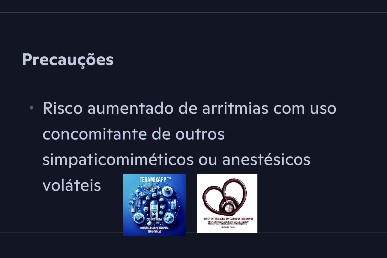• Risco aumentado de arritmias com uso concomitante de outros simpaticomiméticos ou anestésicos voláteis